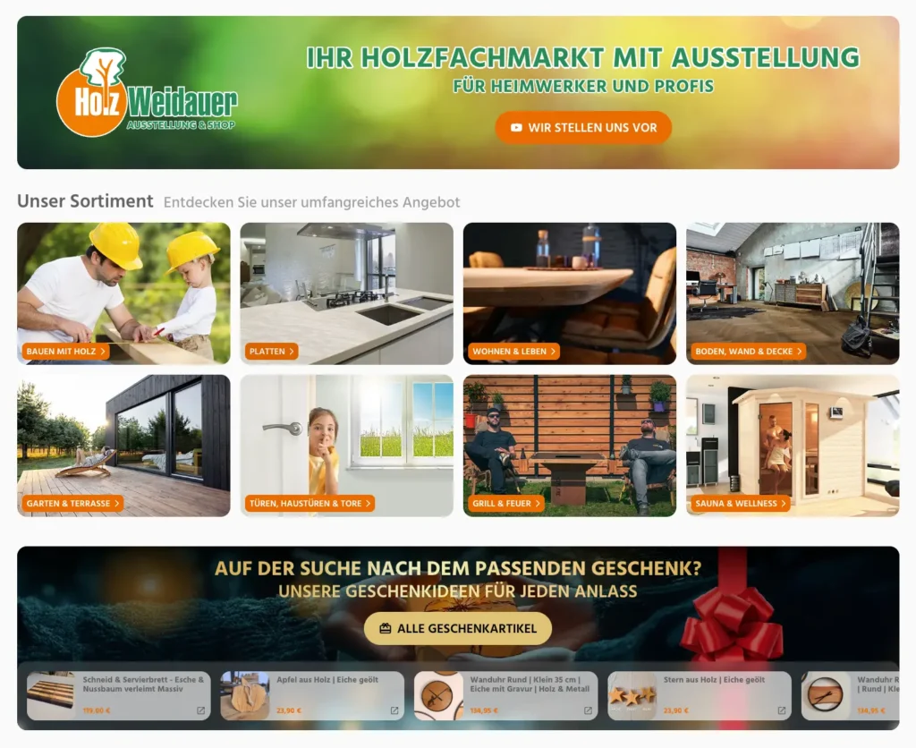 Bereits mehrere Jahre vor dem ersten gemeinsamen Austausch betrieb die Gebr. Weidauer GmbH den Holzweidauer Onlineshop. Verantwortlich für den digitalen Auftritt war ein engagiertes Team rund um Charlie Hacker und Jana Frings. Trotz einer stabilen Basis zeigten die Online-Umsätze ein deutliches, bislang ungenutztes Wachstumspotenzial.